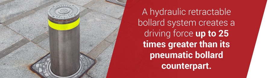 - Hydraulic bollards: Automatic hydraulic rising bollards include an incompressible fluid and pump system that produces linear motion. A hydraulic retractable bollard system creates a driving force up to 25 times greater than its pneumatic bollard counterpart, making it the better choice for heavy-duty applications.