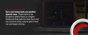Bars and restaurants are another special case. These tend to be locations where there is a higher likelihood that patrons may have had too much to drink, only to get in their car and begin driving. While certainly not every patron does this, the odds of this happening here are much higher than they would outside a church, for example. Indeed, 17% of storefront accidents are caused by driving under the influence.