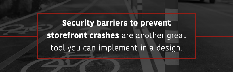 Security barriers to prevent storefront crashes are another great tool you can implement in a design. These serve a dual purpose by creating visual reminders that help keep cars stay in their spaces and pedestrians in theirs. If a vehicle breaches the barrier, it will at least slow the vehicle down and help protect the pedestrians behind the barrier.