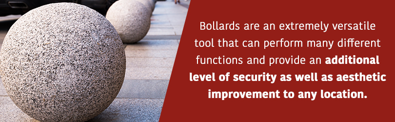 Bollards are an extremely versatile tool that can perform many different functions and provide an additional level of security as well as aesthetic improvement to any location. Never heard of a bollard? They are short posts used to direct or keep traffic out of a certain area.
