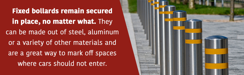 Fixed bollards remain secured in place, no matter what. They can be made out of steel, aluminum or a variety of other materials and are a great way to mark off spaces where cars should not enter. One of the advantages of this type of bollard is how sturdy it is. These bollards aren’t just designed to be a visual reminder. They’re also a great line of protection if a rogue car attempts to breach this barrier — whether through accident or intent.