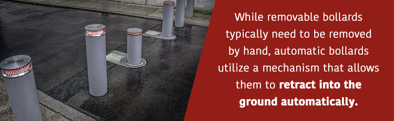 These are a specific subset of removable bollards. While removable bollards typically need to be removed by hand, automatic bollards utilize a mechanism that allows them to retract into the ground automatically. The advantage here is obvious — these bollards are more convenient and less time-consuming.