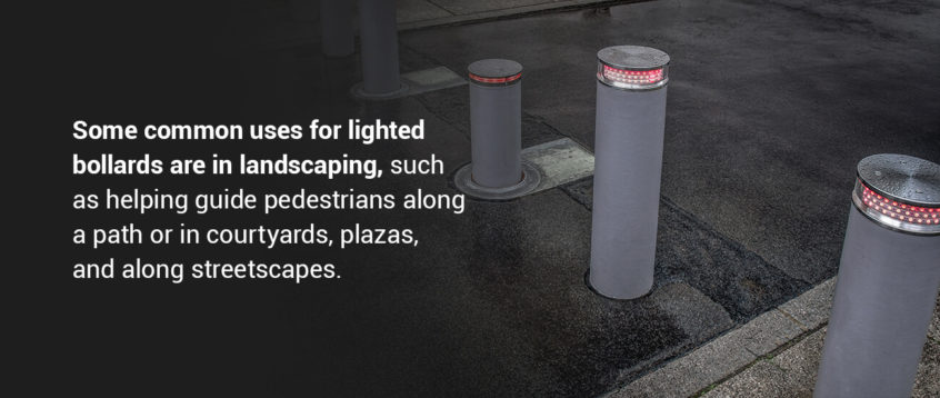 Some common uses for lighted bollards are in landscaping, such as helping guide pedestrians along a path or in courtyards, plazas, and along streetscapes. They can be used anyplace that’s likely to experience a fair amount of traffic after dark, and where extra light would be helpful.