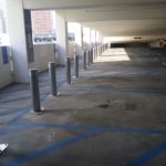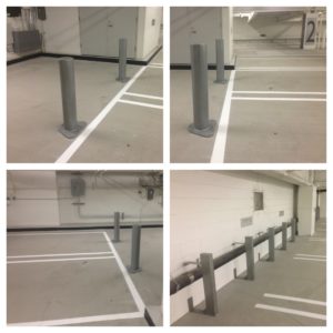 Safety concerns at additional areas of the parking garage were addressed with surface mounted bollards. The D-Shaped Surface Mounted Bollard is a design unique to Blockaides. The shape of the base plate provides for additional strength in comparison to standard surface mount models. Additionally, Blockaides designed a custom Attenuating Asset Protection Barrier to protect critical pipes from vehicles parking in head on spaces.