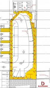 The owners of the parking garage have worked hard to protect pedestrians and customers inside the garage. These protections included increased lighting, designated paths of travel, video surveillance, and the installation of a variety of steel barriers to protect pedestrians and property from wayward vehicles. With extensive installations on grade and on upper floors with post-tensioned construction, Blockaides worked to make sure that affordable, effective and attractive protective devices were designed and installed. The following are examples of the solutions that were executed for this project.